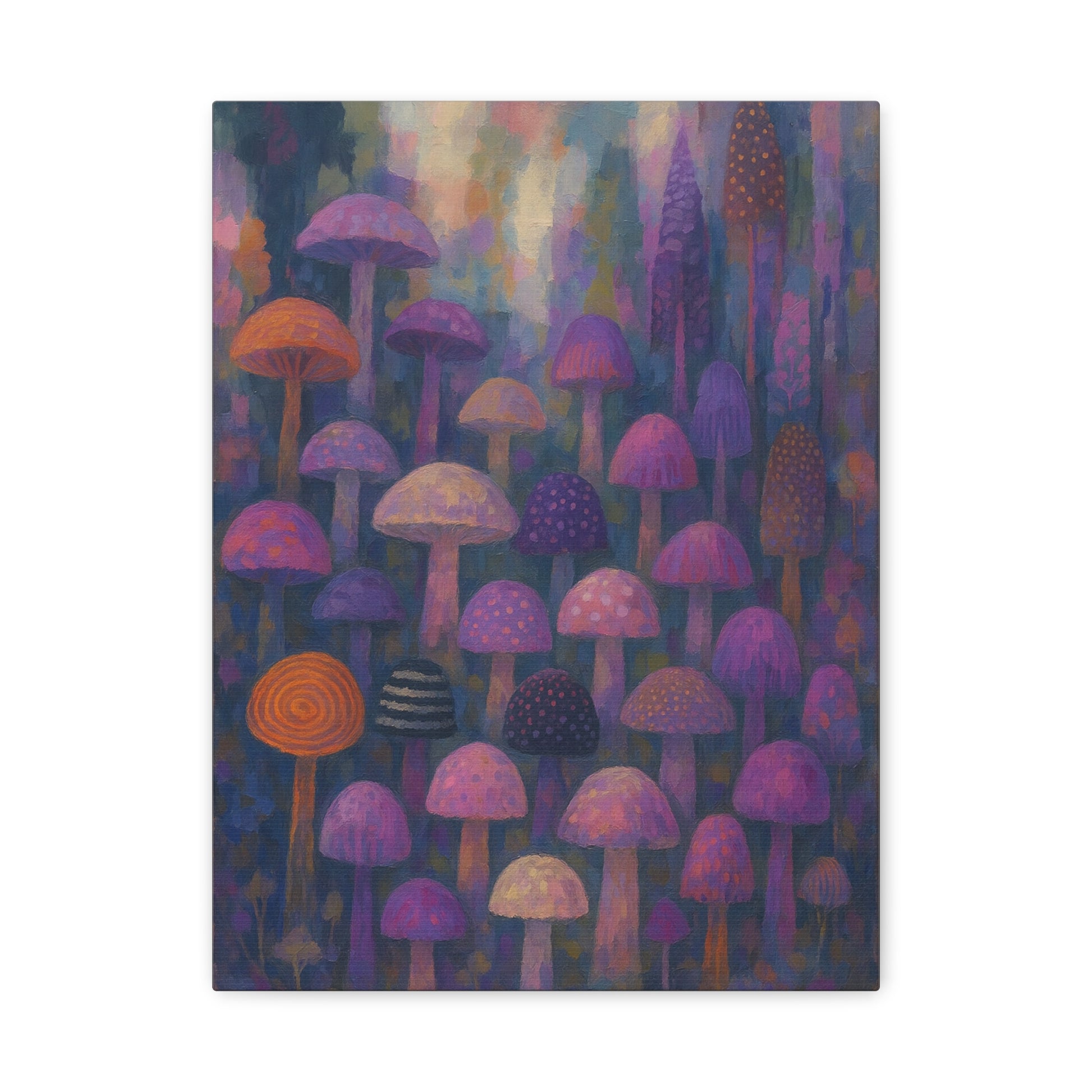 This whimsical canvas print features a dreamy collection of mushrooms and fungi in rich jewel tones—deep purples, vibrant pinks, warm oranges, and midnight blues. Each mushroom has its own personality, with unique patterns, textures, and shapes that create a captivating woodland scene.